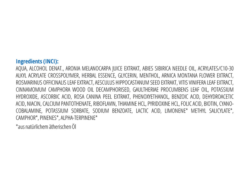Pflanzliche Kombination aus: Menthol, Kampfer, Rosskastanie, Fichtennadeln, Arnikablüten, Rosmarinblätter-Extrakt, Original Cellin mit Aronia, 39 Kräuter, Vitaminen und OPC.