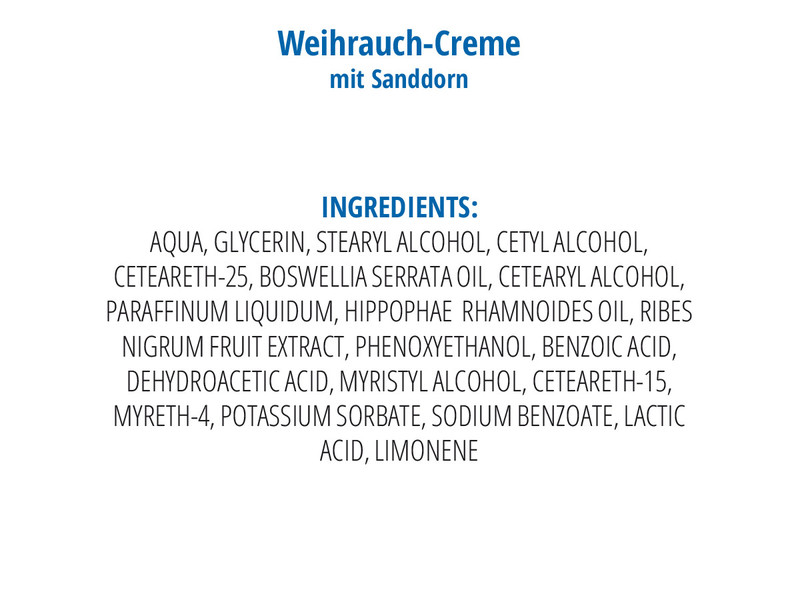 Die optimal aufeinander abgestimmte Kombination von Weihrauch und Sanddorn wirkt nachhaltig entzündungshemmend und regenerierend. Ein Jungbrunnen für alle empfindliche Hautpartien.